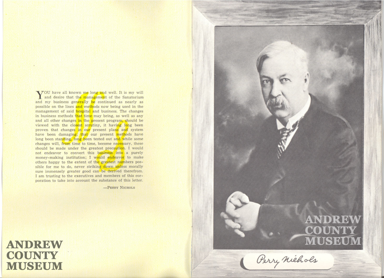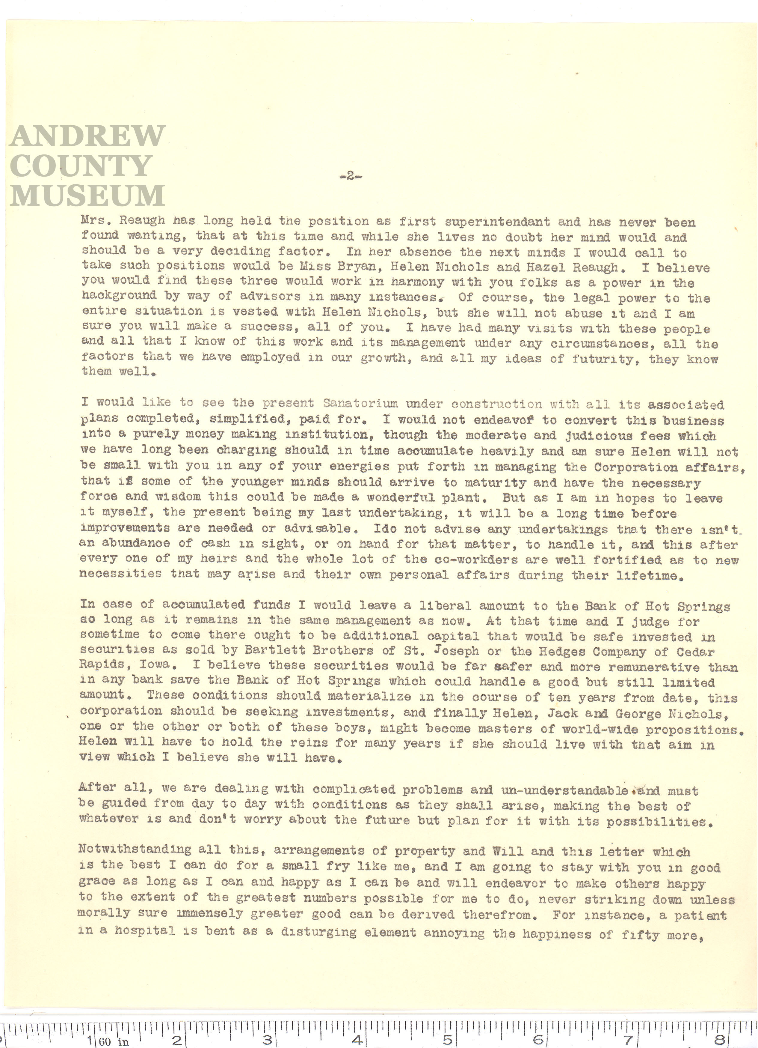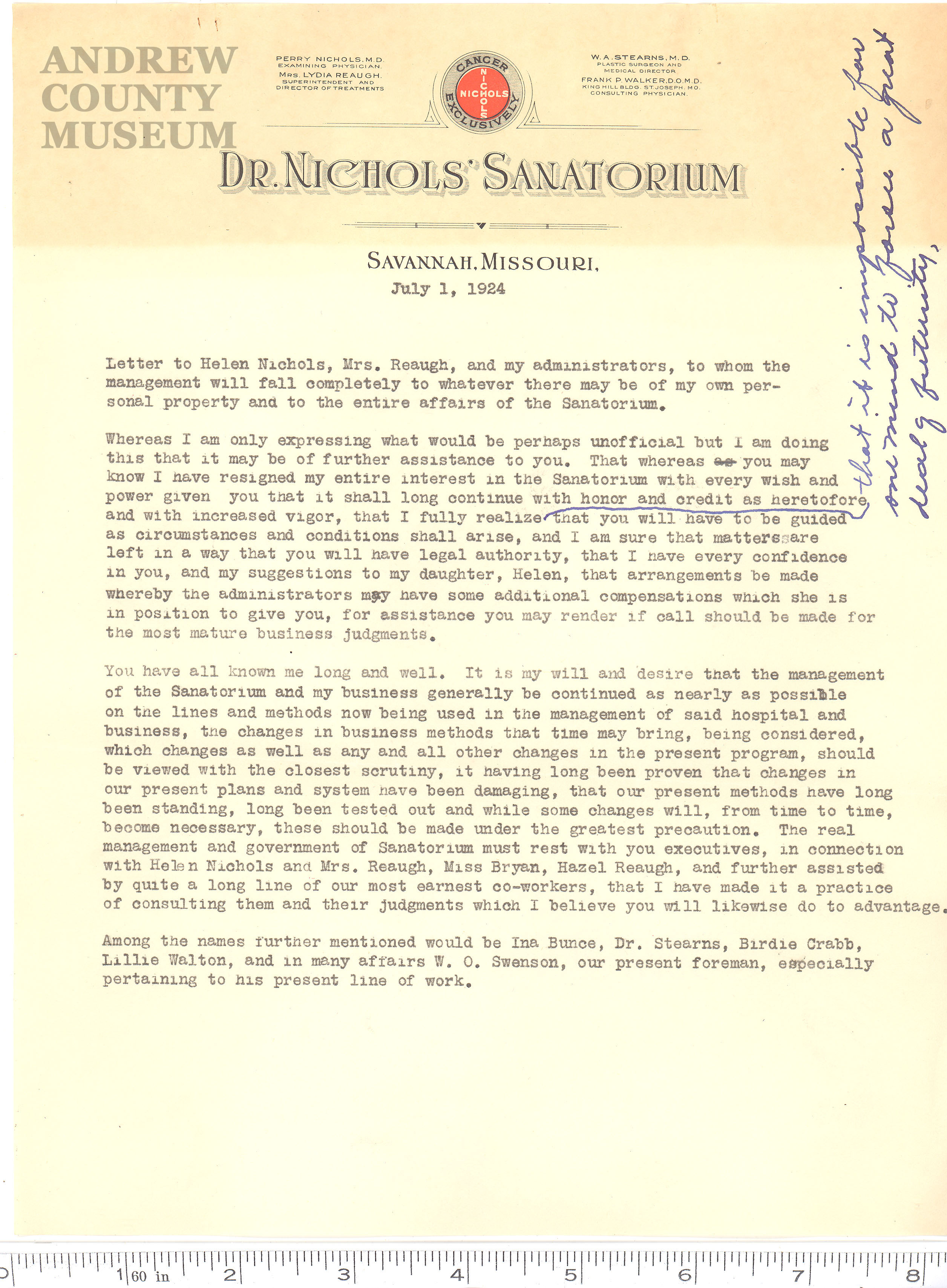 for his staff, that the Sanatorium would long outlive him. In fact, he wrote this "Will" in 1924,
